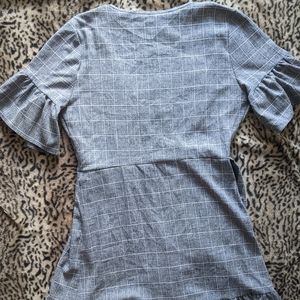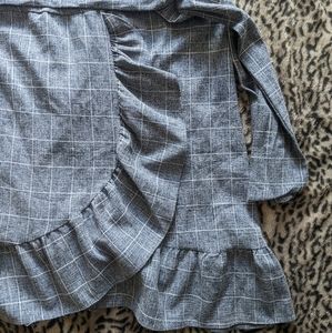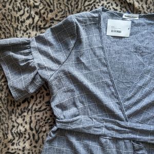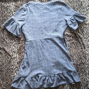 Beautiful NWT wrap dress in a heathered blue with white window pane print from Newberry Kustom brand. Ruffles around the sleeves and bottom hem. Never worn, great condition!