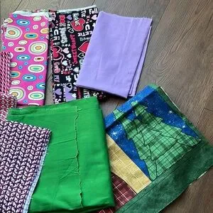 Vibrant assortment of fabric pieces. Perfect for crafting and sewing projects. Includes various patterns and colors.