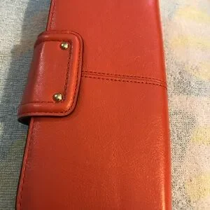 A vibrant orange-red leather wallet by Coach, featuring a rectangular shape and a flap closure with visible stitching.