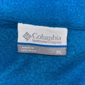 Columbia fleece XL jacket. Smoke free home. Lighting made it dufficult to capturere accurate color. Color is more like a Teal color