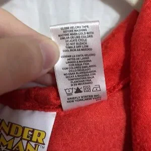 Unisex Wonder Woman onesie with a removable cape. The hood has her tiara/crown on it. Lightweight material. Zipper is broken - the track is on both sides but the zipper itself is gone. Cat friendly home. Checkout my closet for Superman onesie!