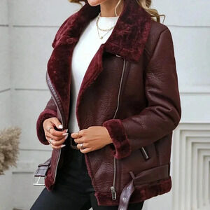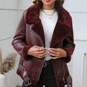Burgundy Casual Women's Faux Leather Winter Jacket