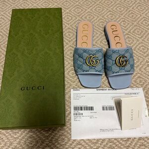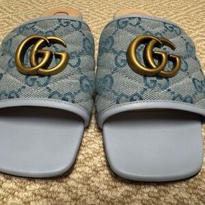 These are like new condition - wore ONE time and sadly they are too small. They are in perfect condition. Beautiful French blue color with gold hardware from last season that sold out immediately. Purchased from Neiman Marcus, photo of receipt included. Authentic. Shoe box included.