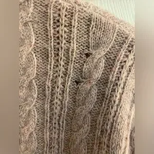 Color is a pinkish purple. Size Small. 40% nylon, 30% alpaca, 30% wool. Dry clean. Measures approximately 19" armpit to armpit, 25" sleeve, 28" length. Preowned condition with two small holes on the backs show in photos.