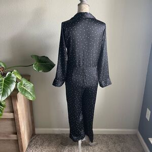 Printed Jumpsuit by Lucky Brand in Black with White Polkadots. Jump into this silky smooth jumpsuit designed with flap pockets and a tie to cinch the waist. Button down. Collar. Long sleeves. Pockets. Gently worn, belt is missing. Measurements in photos.