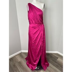 NWT Ieena for Mac Duggal One Shoulder Slit Satin Faux Wrap Maxi Gown Berry Sz 6 $398