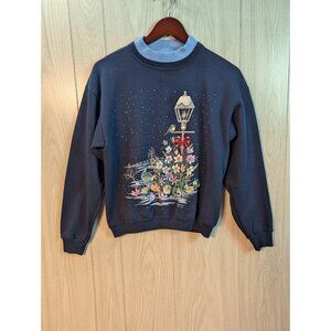 Morning Sun Flowers Snow Christmas Lamp Bow Blue Crewneck Sweatshirt Size Small