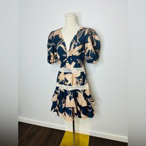 ring detail at the neckline and full puff sleeves finish this printed ruffle hem minidress.