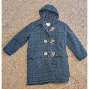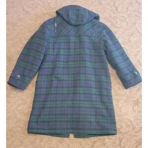 This vintage 80s LL Bean duffle over coat is a must-have for any fashion-forward woman. Made from high-quality wool, this blue and green plaid coat is perfect for any occasion. The size is a regular women's size large and the style is an overcoat with a classic 80s theme.
