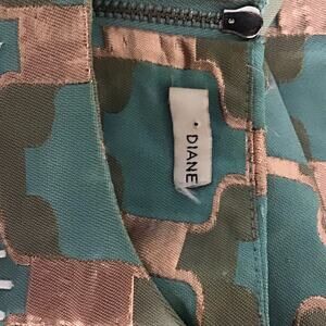 The Diane von Furstenberg Akoni dress is a refined rendition of the sheath featuring a geometric pattern with a metallic sheen and embellished with paillettes. Geometric jacquard with embroidery detail. Round neckline; yoke embellished with metallic paillettes. Sleeveless. Sheath silhouette with slash pockets. Back zip, darts for shaping, tailored seaming. Interior pocket has a small stain but is inside pocket, does not affect wear and otherwise this is in impeccable condition, ready to wear for any occasion!