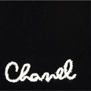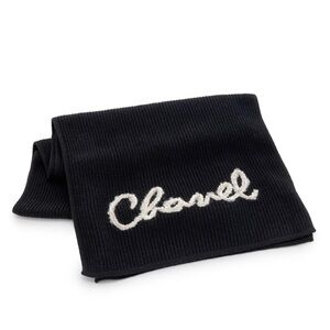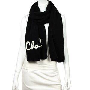 Chanel 100% multi-ply ribbed Cashmere Black Stole Scarf. Hand Embroidered White Resin Pearls create the iconic CHANEL logo.