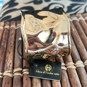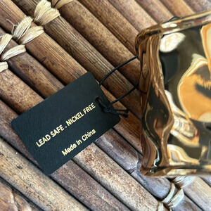 Wide cuff bracelet in metal with a gently hammered finish and wavy edges.