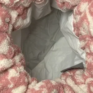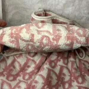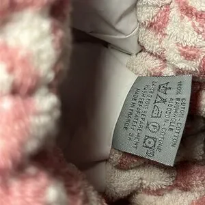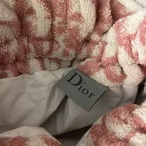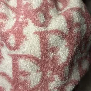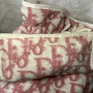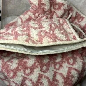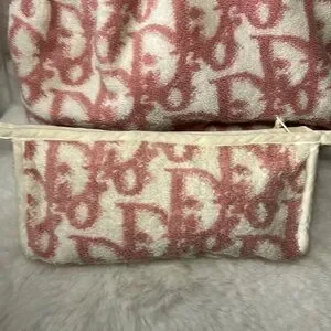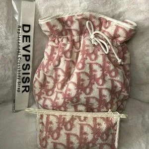 Dior cute pink and cream large terry drawstring pouch bag with pouch and strap to make a crossbody. Preowned with small wear. Small pulls on outside and a couple of small yellowish stains but hard to see. Inside is a coated material for cosmetics etc. comes wirh cosmetic bag that has some light yellow stains inside and a couple of pulls on the terry. Both in good condition condition besides the flaws listed. Including a white strap and attachments to make a crossbody bag.