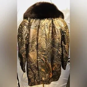 Vintage SZ 3X Jacobson’s Leathercraft black/gold jacket with black (*fox) fur collar. The “Leathercraft” tag is still inside; however, the Jacobson’s tag has been removed. The fabric content tag indicates 100% leather; however, the fur type isn’t listed. *Through research I found that other coats like this one have a fox fur collar. The fur is real, I just can’t swear to the type of fur; but I believe it to be fox. The jacket has a snap front and two side pockets. It is in perfect condition with no flaws or call outs. The leather has been cleaned and conditioned.