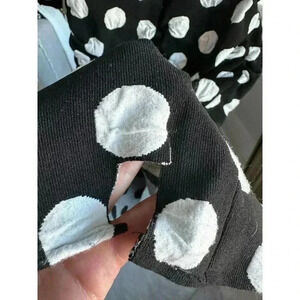 Black polka dot cotton plain weave (95% Nylon, 5% Spandex ). Hourglass. Short sleeves. Sweetheart. Back zipper closure. 37.5" from shoulder to hemline.