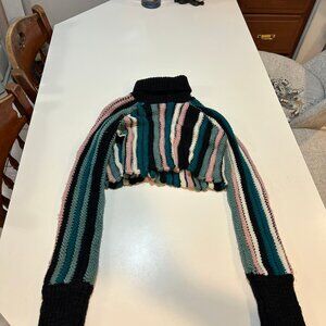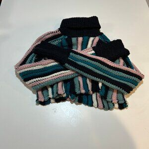 Multicolored stripe knit (50% Wool, 37.5% Cotton, 12.5% polyester). Sweater. Turtleneck. Long sleeve. Pull-on. 16" from shoulder to hemline. Imported.