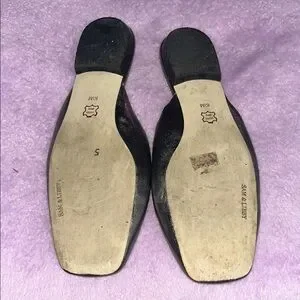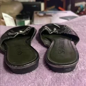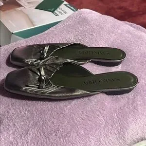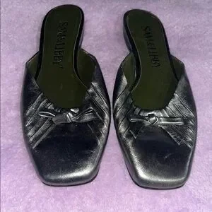 These slip-on mules feature a square toe design, gathered vamp, and a smooth, glossy material upper.