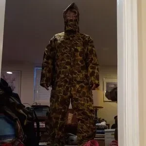 Truly magnificent coverall full fit snow suit duck camouflage in great condition. A little wear on the cuffs of the sleeves and bottoms.