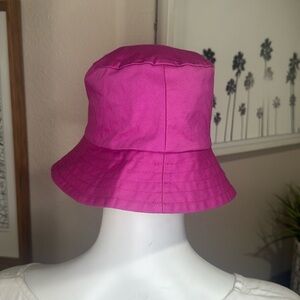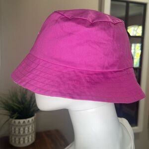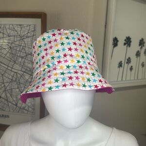 Never wore! One side is pink with an embroidered white inner star, and the other features a cheerful multicolored star pattern on a white background. Head circumference 20.5”; Brim 2.25”.