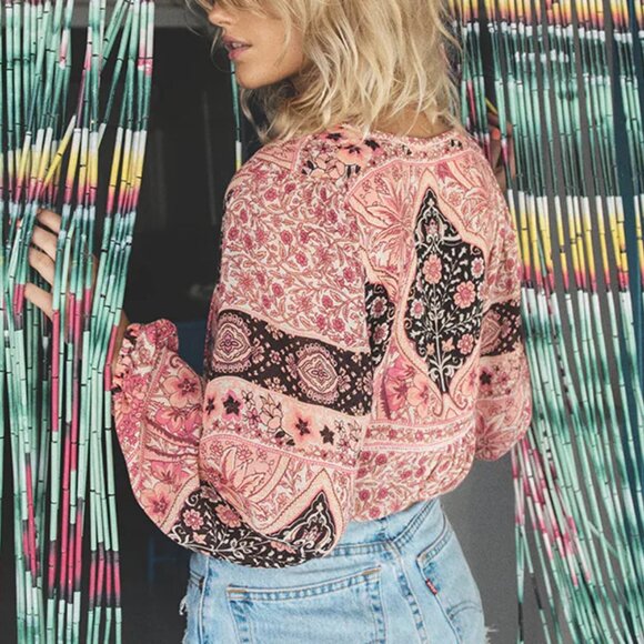 Beautiful long sleeve boho top in complimentary shades of pink outlined in brown with black sections of contrasting print. Bali vibes! πππΊπ΄