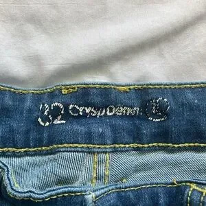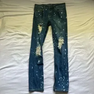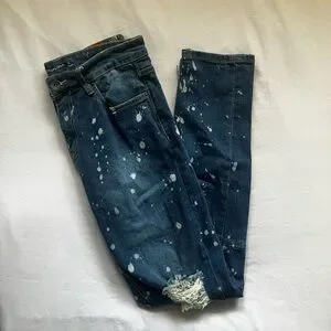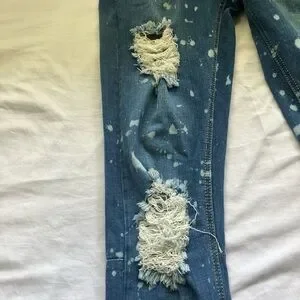 White Paint Splattered detailing, adjustable zipper at ankle of jeans, and rips.