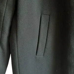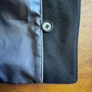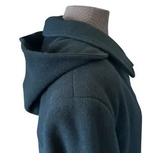 This mid-length black wool coat is a great classic wardrobe staple item that will never go out of style. Very soft to the touch in a quality wool and nylon blend fabric. Smooth polyester lining. Single breasted button closure with detachable button-on hood, slit pockets, and traditional collar that can button all the way up to keep you warm. In excellent nearly new condition. Clean and very gently worn. Dry clean only. From smoke and pet free home.