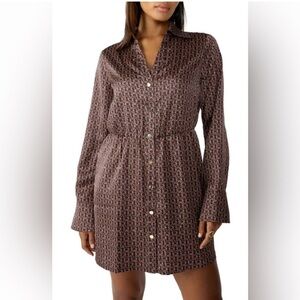 The pefect long sleeve dress for those cooler months. Features sleek satin with an allover geometric print and a stem-showing silhouette. Spread collar. Long sleeves with button cuffs. Fabric - 100% Polyester. Machine wash, dry flat. True to size. 33" length.