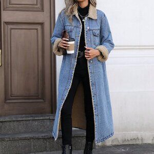 Blue Casual Women's Trendy Fleece-Lined Long Denim Jacket