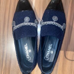 Chanel Navy/Black tweed cloth and patent leather mocassins with charms. I do not have the original bag and box. These shoes are about $1000 and still in good condition. Authentic. Size 38EU