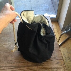 Vintage Chanel Beach Bag. This was probably a gift-with-purchase distributed by the company’s US cosmetic group. The piece is made of heavy canvas and has a waterproof lining. The lining has a 3” hole on the bottom (this shows in the photos). The piece is fairly large. It’s 15 1/2” high and has a circular measurement of 11”. Overall, it’s pretty substantial and, except for the lining hole, in good shape.