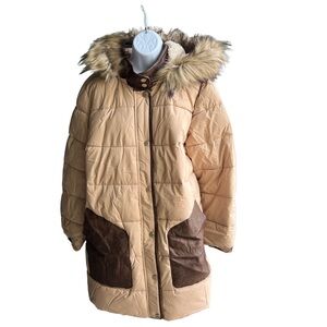 Dennis Basso Size XL Quilted Parka with Faux Fur Trim Hood CAMEL
