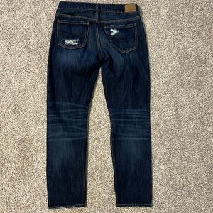 Women’s AE Tomgirl style jeans with distressing at the knees, back pockets and thigh. Dark wash with button closure. 27” inseam, excellent condition.