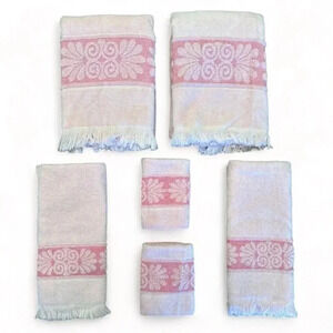 Fabulous Set of Vintage Pink Bath Towels/Linens by Cannon Monticello. There are 6 towels in this set. 2 wash cloths, 2 hand towels and 2 bath towels. All 6 towels are in EXCELLENT condition for being 60-70 years old.