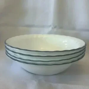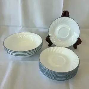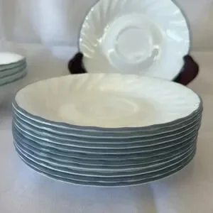 Awesome Set of 16 Vintage Corelle WISTERIA GRAY White Swirl Soup Cereal Bowls and Saucer Plates. Set includes 4 Bowls (7” Diameter and 1.75” Height) and 12 Saucer Side Plates (6.25” Diameter) Bowls hold 20 ounces.