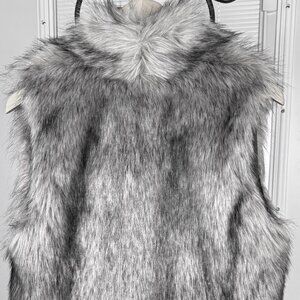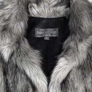 EUC Beautiful Fabulous-Furs Donna Salyers Faux Fur Grey Wolf Hook vest. Velvet pockets in side seams, three hook and eye closures. Super soft and high quality, 100% Acrylic pile faux fur, 100% polyester satin lining. Like new condition.
