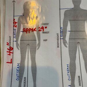 No tags. It has about a 3” opening on the seam of one shoulder that could be easily repaired. Suede panels show minor wear and some flaws on the sleeves that are not really noticeable due to the design.