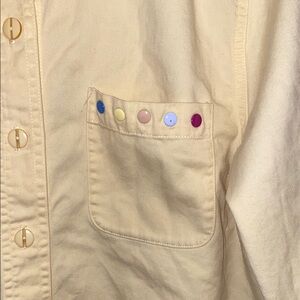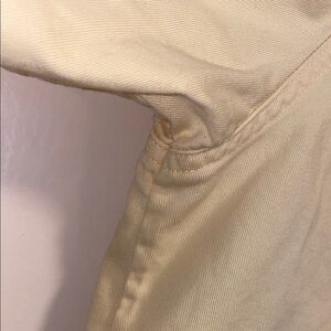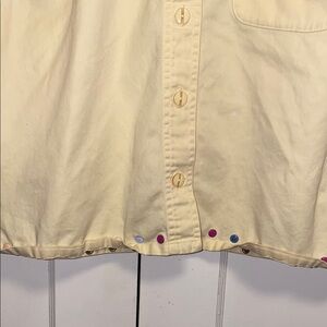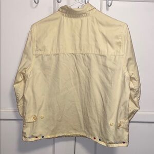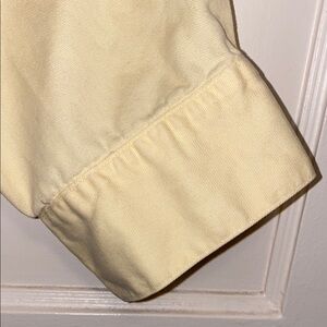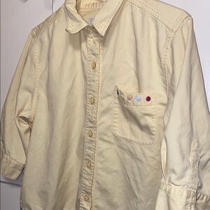 A pale yellow button-up shirt with a collar and three-quarter length sleeves, made of cotton blend fabric.