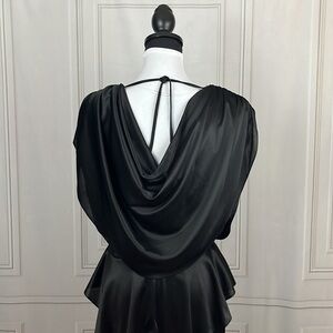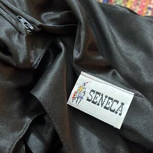 Vintage 1980s cocktail dress lightweight silky material black and metallic silver lace on the front tie and zipper back Seneca brand no size tag but fits like a medium good vintage condition please see pictures