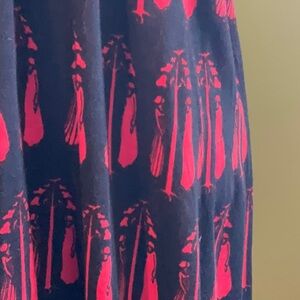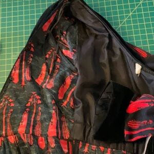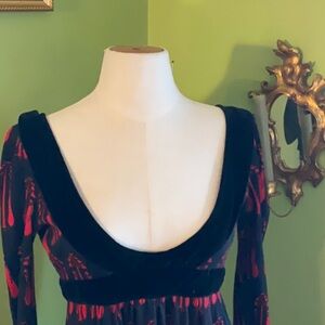 Incredible red Aubrey Beardsley print on navy ground brushed acrylic dress with black velvet neckline detail, waistband, & cuffs. Style is reminiscent of late 15C Burgundian gowns.
