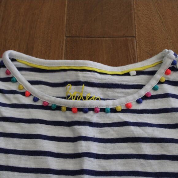 Boden short sleeve t-shirt style dress. White with blue stripes with adorable multicolor pom pom trim around neckline and sleeves. Girls size 9-10. Great condition!