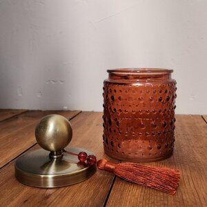 Decorative bumpy glass container with metal lid and bead and tassel. About 6 inches tall with lid, about 3.5 inch diameter.