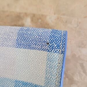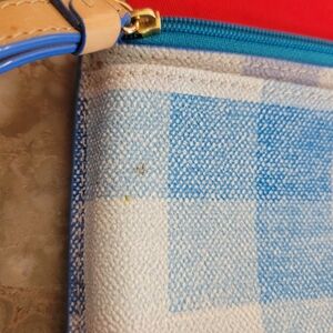 Good pre-owned condition. There are some small stains on the outside as pictured and there is some light lint on the inside as pictured. Overall in good condition. The zipper works well and the snap works well.