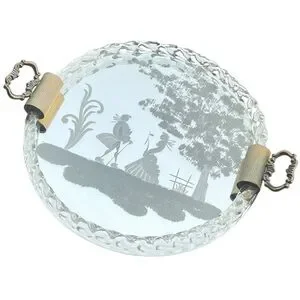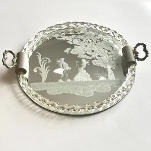Reverse acid-etched mirror with charming gold-flecked image of an 18th C couple in an idyllic nature setting. Twisted glass rope frame surrounds the mirrored base. Finished with gilt metal handles.