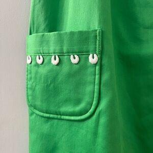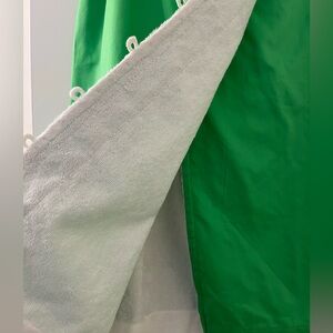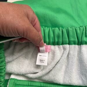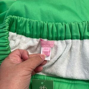 New with tag (no info on tag) Lilly Pulitzer towel wrap in a great preppy green color with white lace - size XS/S. This has a terry cloth interior and closes with velcro at top. Also has elastic at top. Small pocket on front with a small pull as pictured. Great gift!