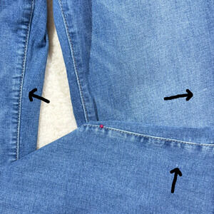 The jeans are preowned and in good used condition, with no rips or stains; however, they have some issues, as shown in the pictures.