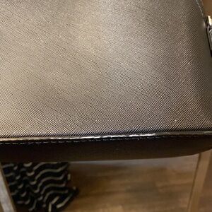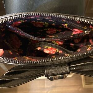 Betsy Johnson small black cross body purse! EUC!! All sliver hardware, has pockets on the inside (one zips), has a bow on the front. The strap does not adjust. It does have a small white mark on the back bottom edge. Not noticeable when you’re carrying it.