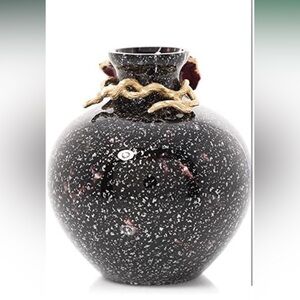 Pewter, 14K matte gold, light brown antique. Hand painted with enamel and hand-set with Swarovski® crystals. Black glass vase with silver speckle.
