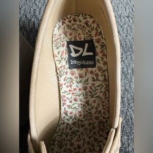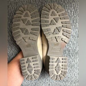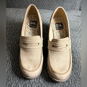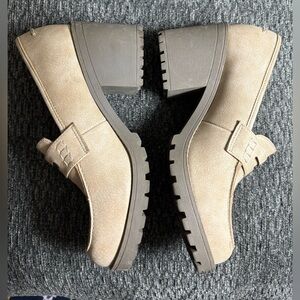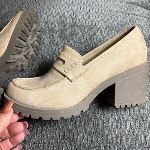 LIKE NEW!! Worn 1 time!! Chinese Laundry Liberty Natural Buck Smooth Chunky Heels Women’s Size 8. Heel is 3”. A very small scuff on the front and a small scratch on the back please see photos. Really cute with jeans!!!