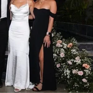 Flattering maxi dress in our soft faux silk fabric, featuring off-the-shoulder detail, thigh-high slit detail and slim maxi skirt.