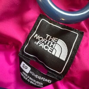 Deep Pink women's size S down Puffer Jacket in Good condition. Small dark spot on right chest and small white spot on left pocket placket (see photos) otherwise good condition. no rips/tears. all zippers intact. velcro at arm holes and short stand up collar; no hood. hits just below the waist. 75 goose down - see tags picture for additional product content. authentic NF product.